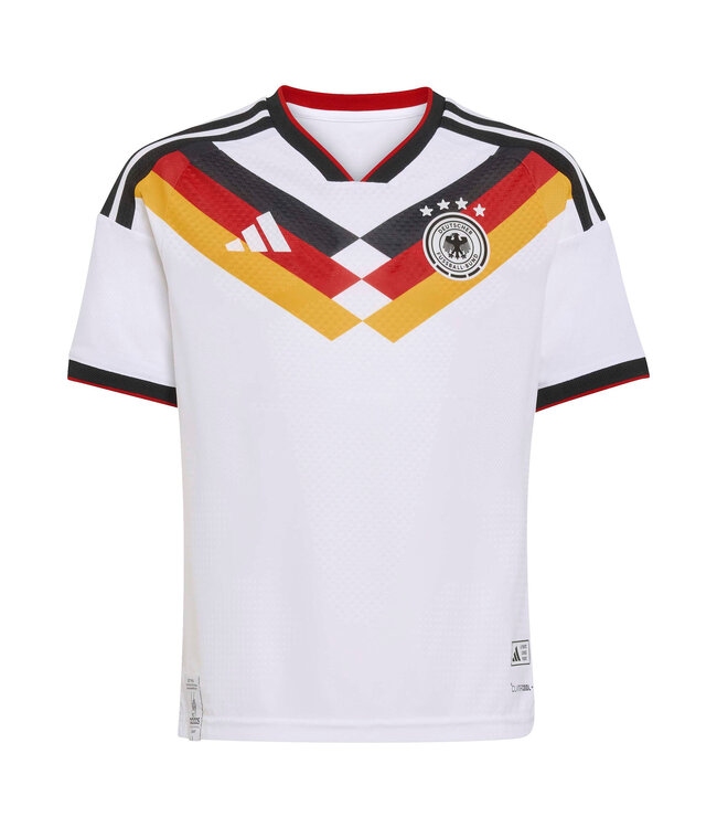 The Germany 26 Home Jersey is designed for young soccer enthusiasts who dream of emulating their heroes on the pitch. This jersey combines the essence of iconic moments with cutting-edge tech so they can stand out in both style and performance. Integrated Climacool fabric technology wicks and disperses sweat for a cool, dry and distraction-free performance while a regular fit offers freedom of movement, so they can feel focused and ready during intense matches. The jersey's doubleknit construction meanwhile offers durability and a soft feel against the skin, making the top a great choice for everyday wear. and with the adidas logo and club crest proudly displayed, your child will feel like part of the team. Let your child feel the excitement of the game with this jersey, where tradition and heritage meet innovation. It's more than just clothing. It's a way of life.