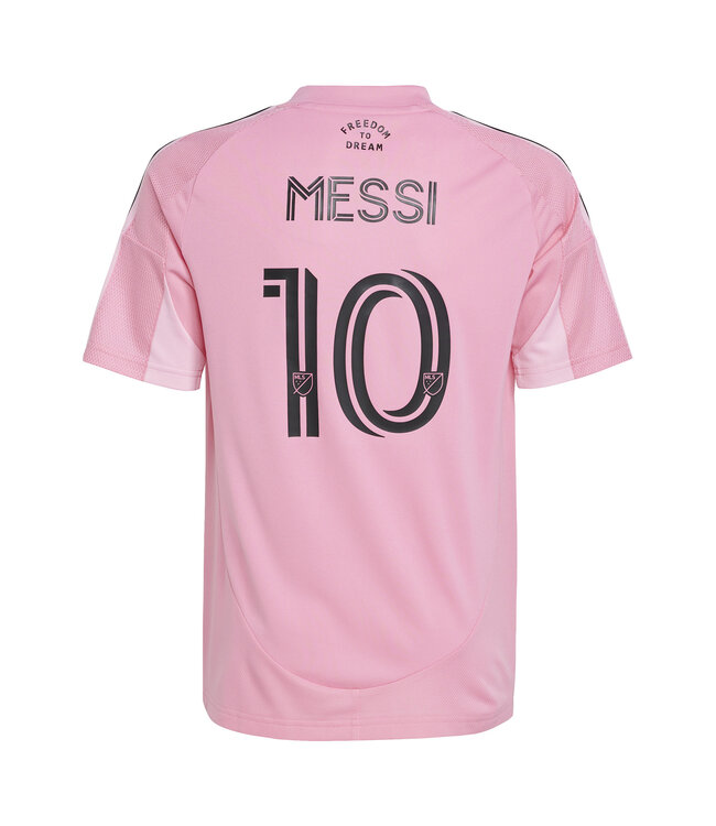 Classic soccer stripes finished in instantly recognizable Inter Miami CF colors. Standing out in two shades of pink, this juniors' adidas jersey leaves no doubts about your favorite club. Created for supporters, it has moisture-managing AEROREADY for all-day comfort and a premium woven badge for full-on team pride. That name and number celebrate the club's greatest player.